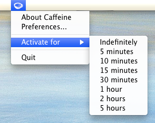 Caffeine est une petite application permettant d'empêcher la mise en veille de votre Mac ou de son écran. Ceci par un simple clic sur l'icône du logiciel dans la barre de menus.