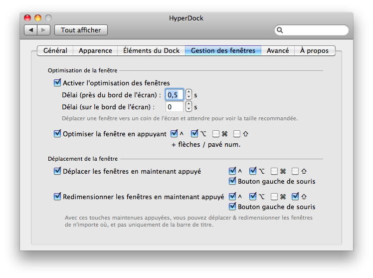 De plus, il est possible, toujours depuis les préférences, de configurer un certain nombre de raccourcis claviers permettant notamment de masquer, redémarrer ou quitter une application en un clic depuis le dock, activer Exposé, ouvrir une nouvelle fenêtre, etc...