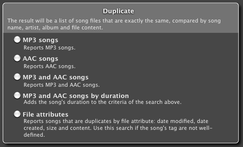 Globalement, que ce soit dans les bibliothèques d'iTunes, de iPhoto, ou une recherche de fichiers directement sur les disque dur de la machine, Tidy Up! repose toujours sur le même principe. Ce qui est également appréciable est le fait qu'une petite explication est toujours présente à côté des options, afin que l'utilisateur comprenne les implications de chaque critères.