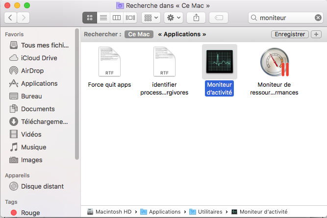 Pour lancer le moniteur d’activité, allez dans le Finder et dans le champs de recherche tapez « Moniteur ». Cliquez ensuite sur le résultat correspondant.