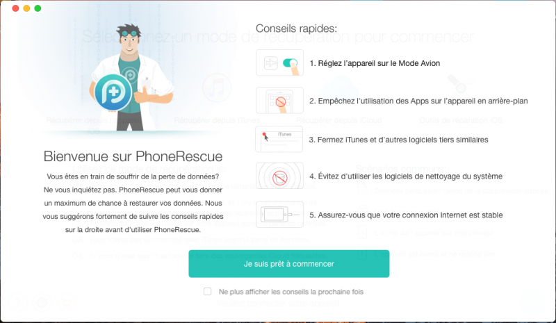 Pour récupérer les données d’un iPhone, vous devez au préalable le passer en mode avion comme demandé lors du démarrage de PhoneRescue.