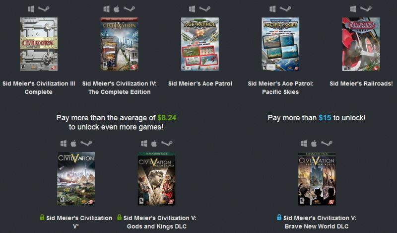 Si vous dépensez plus que la moyenne des joueurs qui s’élève actuellement à 8.24$, vous récupérerez également Sid Meier’s Civilization V ainsi que le premier DLC Gods ans Kings. Ce jeu reprend le principe de son prédécesseur en améliorant l’intelligence artificielle de l’ordinateur ainsi que de nouveaux paramètres à prendre en compte. Le DLC Gods and Kings apporte du nouveau contenu comme des civilisations ainsi que des éléments des anciens opus comme la religion ou l’espionnage.