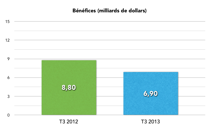 Mais cette baisse n’est rien comparée à celle des ventes d’iPad. En effet, première mauvaise nouvelle pour Apple, -14,33 % de ventes d’iPad en un an. Alors qu’au troisième trimestre 2012 la firme américaine annonçait 17,02 millions d’iPad vendus, elle en affiche que 14,600 millions ce trimestre. Une déception conséquente pour la marque à la pomme qui espérait en vendre 18,04 millions. La chute continue cette fois avec l’iPod, qui s’est vendu à 4,589 millions d’exemplaires contre 6,754 à cette même période l’année dernière, soit une baisse de -32,32%. Des données financières alarmantes qui se répercutent sur le bénéfice de l’entreprise. Malgré un chiffre d’affaires plutôt stable (35,3 milliards de dollars au T3 2013 contre 35 milliards de dollars en 2012), Apple voit ses bénéfices reculer fortement. En effet, le bénéfice trimestriel d’Appel a été divisé en deux, en l’espace de six mois. Affiché à 8,8 milliards de dollars au troisième trimestre 2012, il est désormais de 6,9 milliards de dollars.